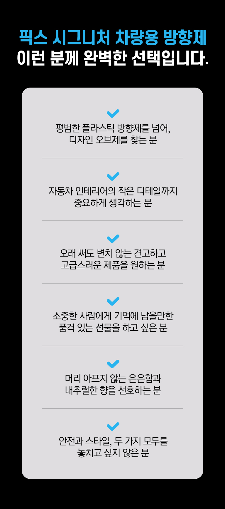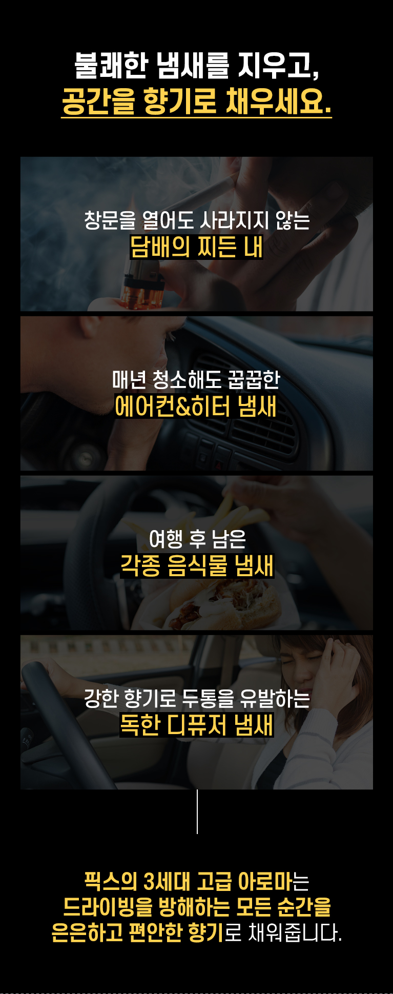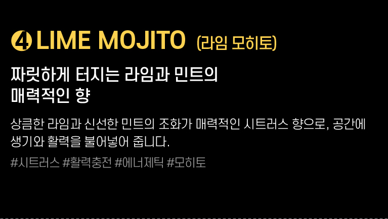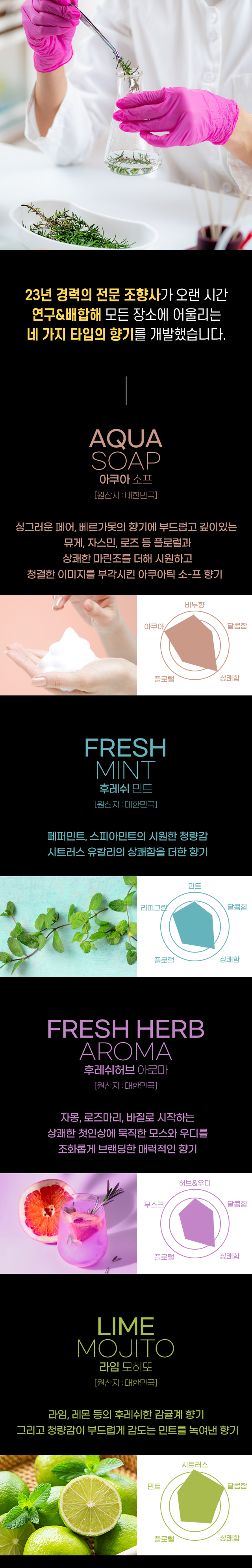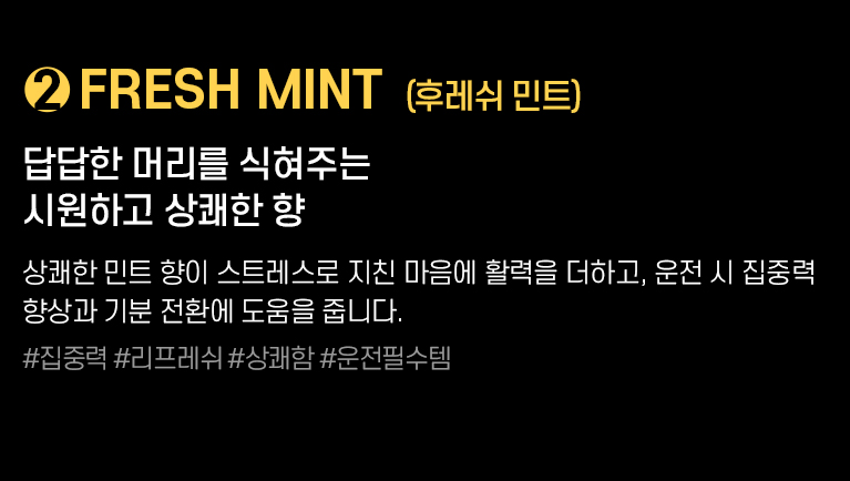Â÷·®¿ë »Ó ¾Æ´Ï¶ó ½Ç³»¿ëÀ¸·Î »ç¿ëÇÒ ¼ö ÀÖ´Â ÃÖÀûÈµÈ Çâ±â¸¦ ¿À·£ ½Ã°£ µ¿¾È ºí·»µùÇÏ¿© ¿Ï¼ºÇß½À´Ï´Ù. »óÄèÇÏ°í µû¶æÇÑ Çâ±â µî 4°¡Áö ¿É¼ÇÀ» Á¦°øÇÏ¿© ¸ðµÎ°¡ ¸¸Á·ÇÏ´Â Çâ±â ¼±ÅÃÀÌ °¡´ÉÇÕ´Ï´Ù.